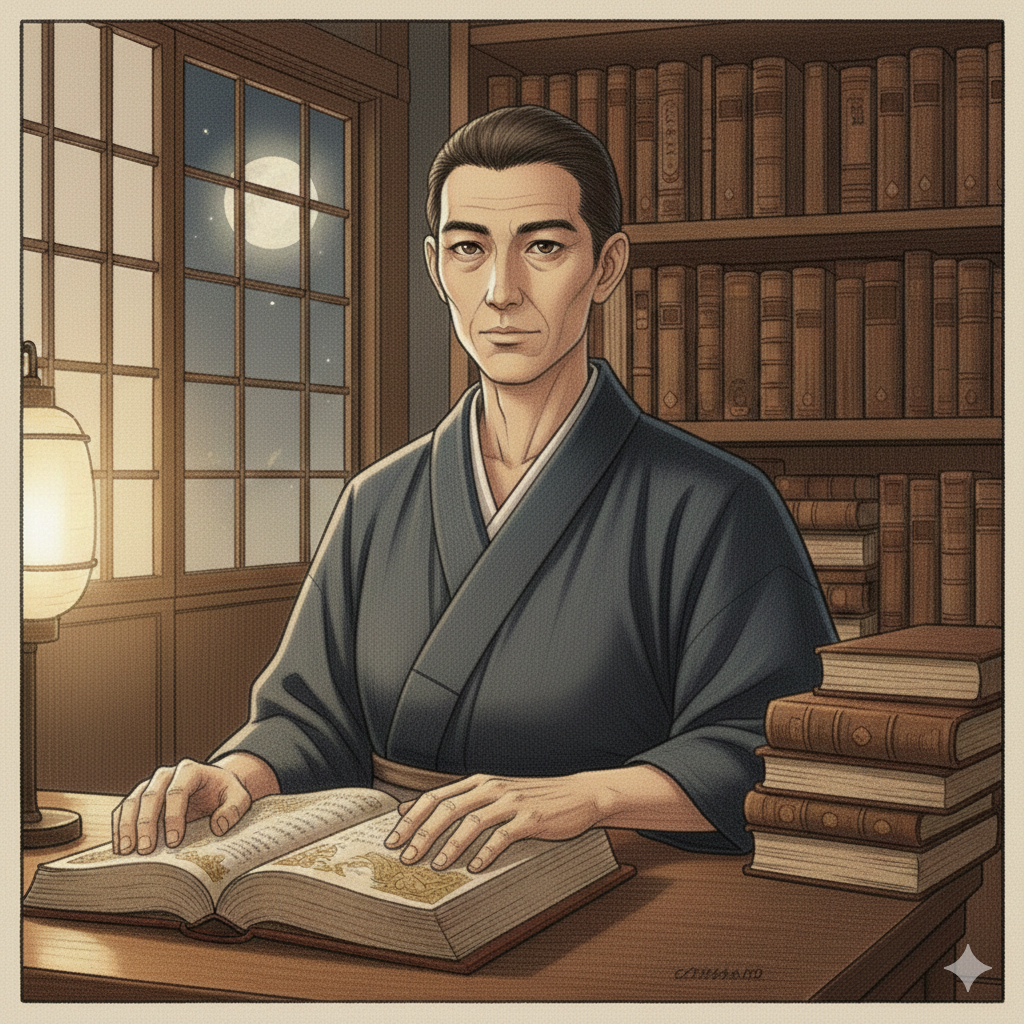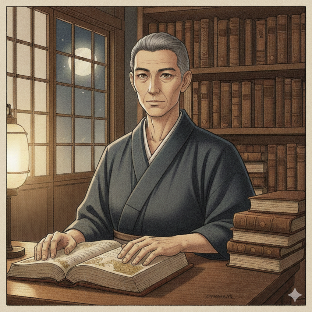 - 人物像: 40代〜50代の、知性と落ち着きを湛えた人物。目元には鋭い集中力と、長年の研鑽を感じさせる穏やかなシワがある。
