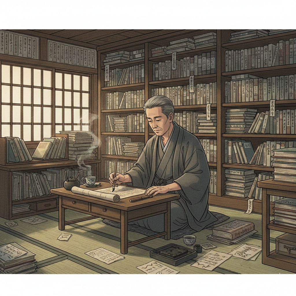 この「穏やかな賢者」という実像に近いイメージで、改めて書斎で原典と向き合っているようなイラストを生成してみてもよろしいでしょうか?それとも、このまま次の具体的な作業(原典の読解など)に移りましょうか?